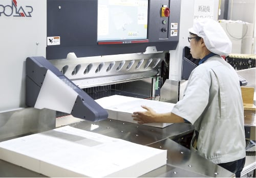 社員の安全を第一に考え、安全装置が充実した断裁機を取り入れています。切断順序等がコンピューター制御で分かりやすく、取り扱いも容易です。